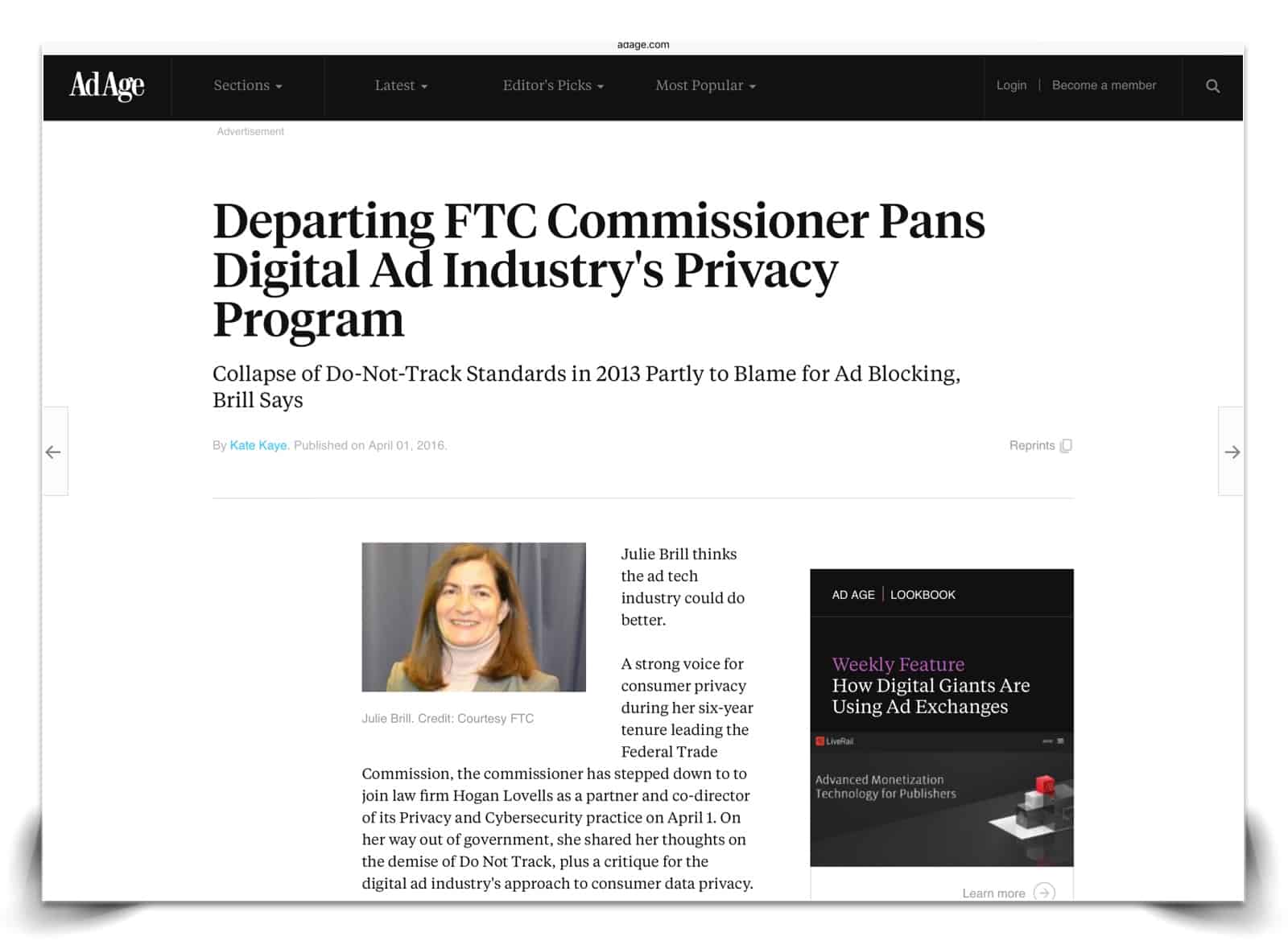 ”I still think that the ad tech industry in particular can provide consumers with robust, meaningful and useable tools so that they can make choices with respect to data collection and use,” Ms. Brill told Ad Age.