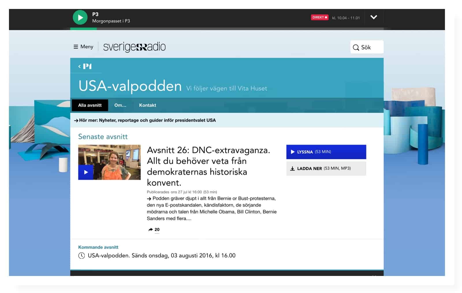 Podcasten har rullat ett tag nu. Det finns 26 avsnitt att lyssna på och nästa avsnitt kommer den 3 augusti 16.00. I podcasten ger Sveriges Radios experter, kommentatorer och korrespondenter sina bilder av det amerikanska valet ur flera olika synvinklar.
