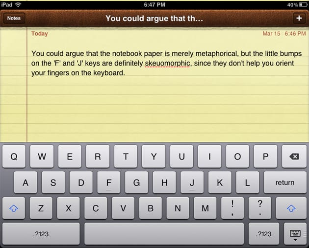 Det kanske vanligaste exemplet på skeumorfism är den gamla designen av Anteckningar/Notes. En brun läderkant, avrivet papper och gult randigt papper.