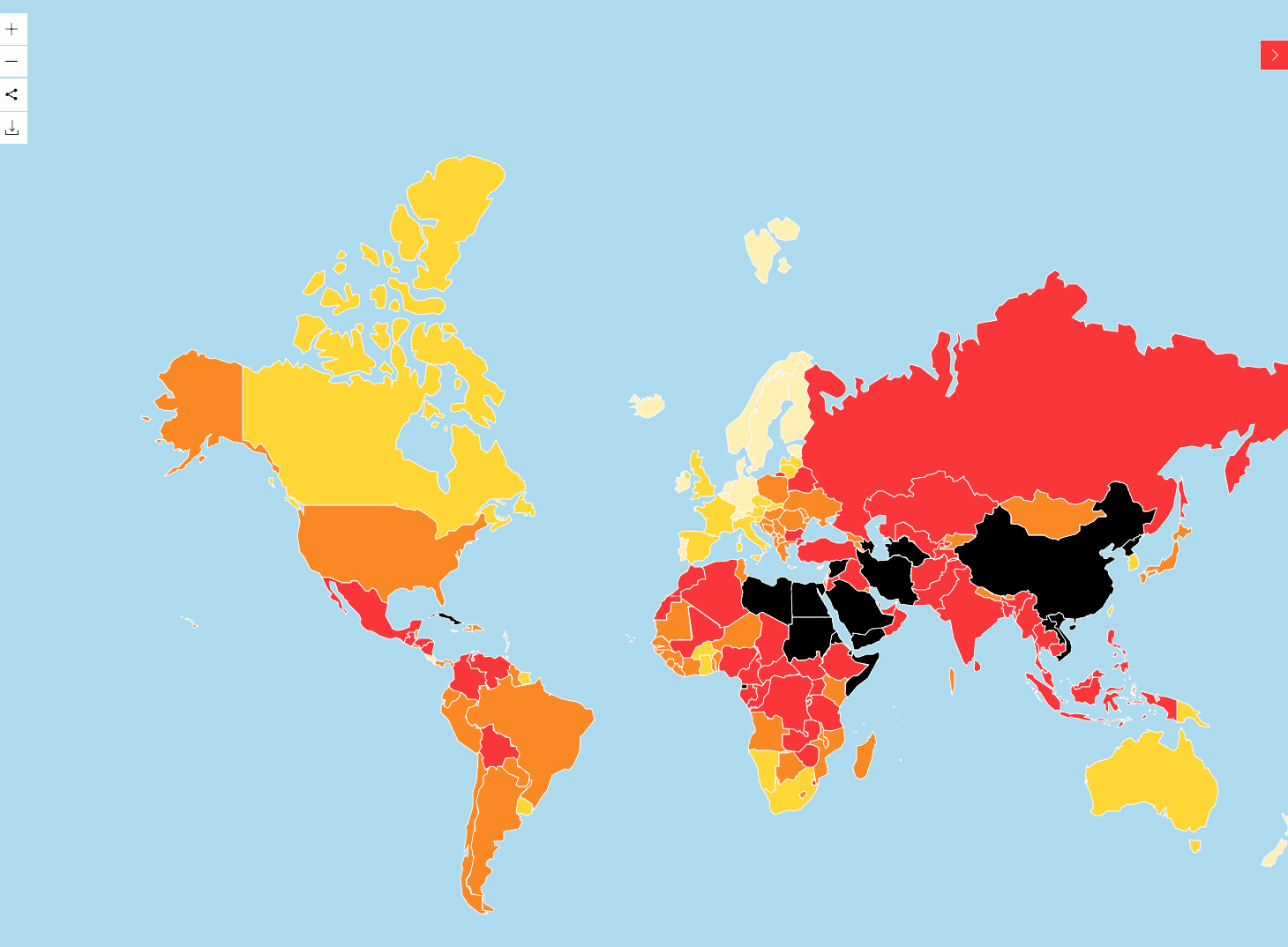 Reportrar utan gränser följer utvecklingen av pressfriheten i ett stort antal länder och nu har USA flyttats ned, fått orange färg vilket är resultatet av Donald Trumps ständiga attacker på fria medier.