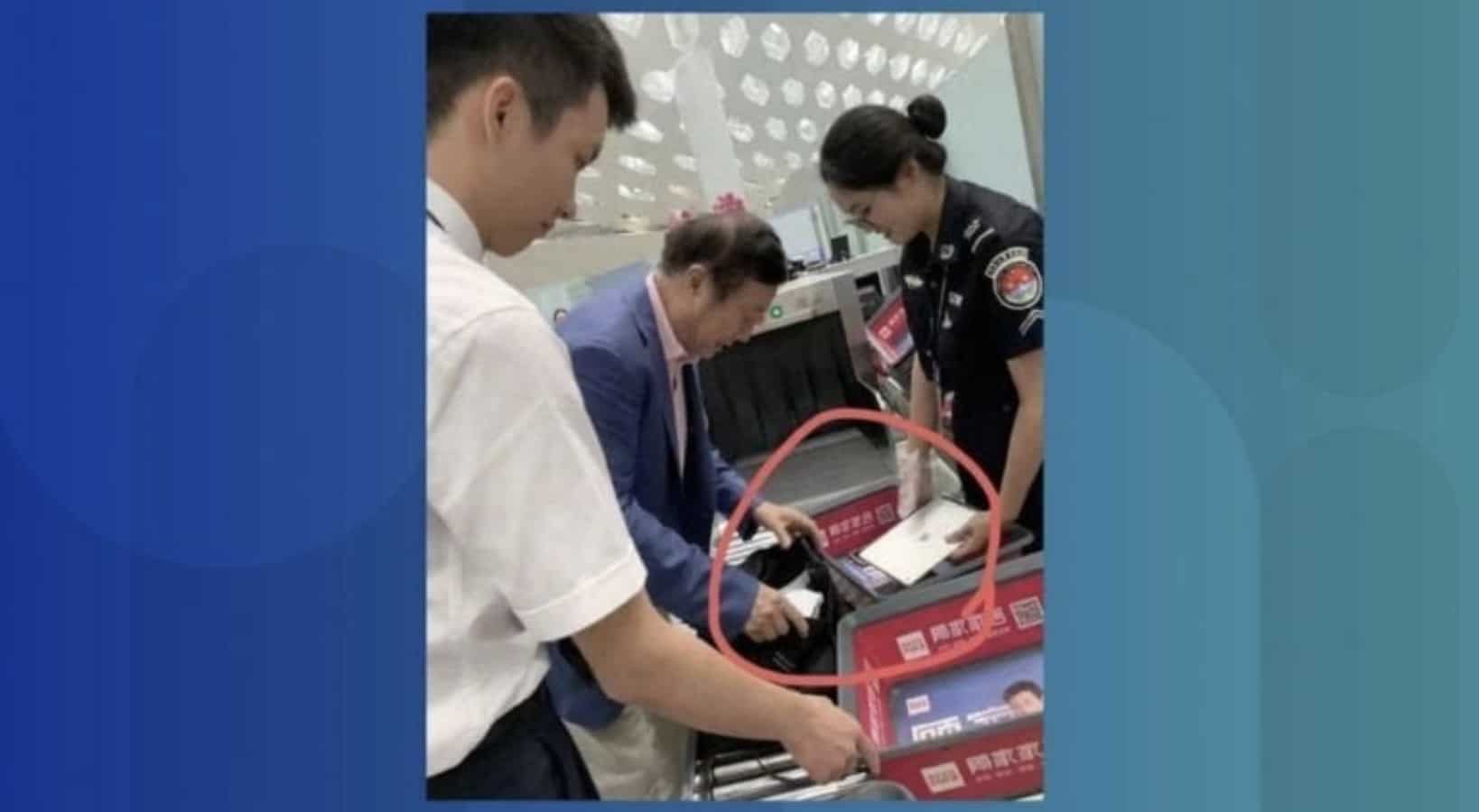 Det skulle kunna vara vilken flygpassagerare som helst som får sitt bagage genomgå eget. En iPad hålls upp, inget konstigt med det. Förutom att mannen är ekonomochef på Huawei.