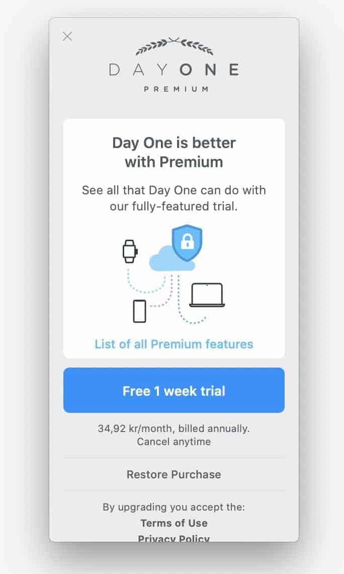 Jag tänkte då samla anteckningar om gjorda uppdateringar för att snabbt kunna ”backa bandet” om det skulle uppstå några problem. Det får jag alltså inte göra. Jag får inte skapa en ny rubrik/avdelning i en app och ett program som jag en gång har köpt. Jag har inga problem om Day One inför prenumerationer för nya kunder lika lite som jag har problem med att day One meddelar att nu får jag inte fler uppdateringar.