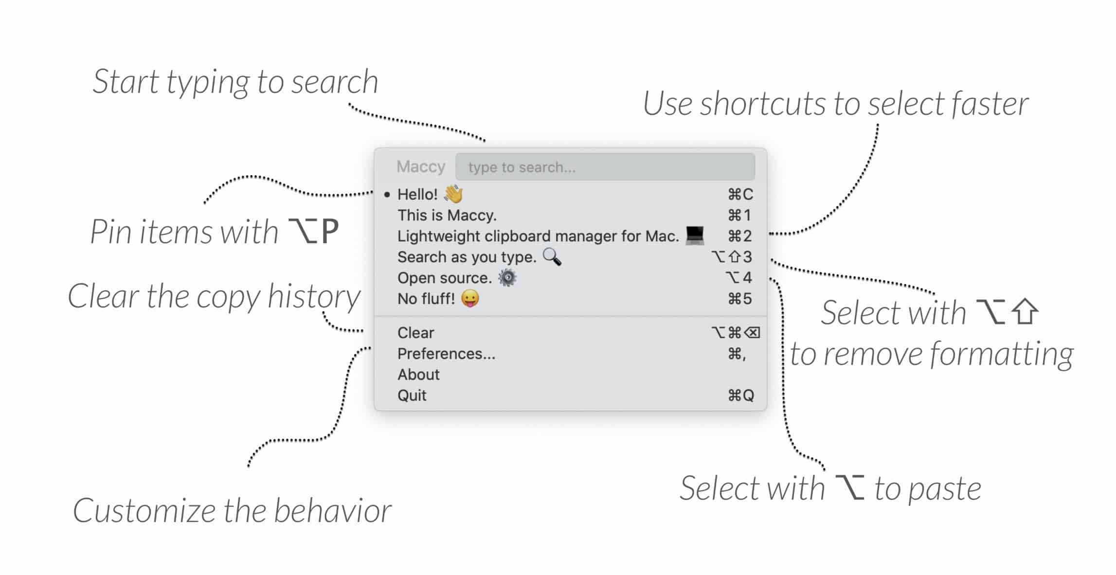 Maccy är en liten, smidig urklippshanterare för macOS. Det sparar historiken för vad du kopierar och låter dig snabbt navigera, söka och använda tidigare innehåll från urklipp.
