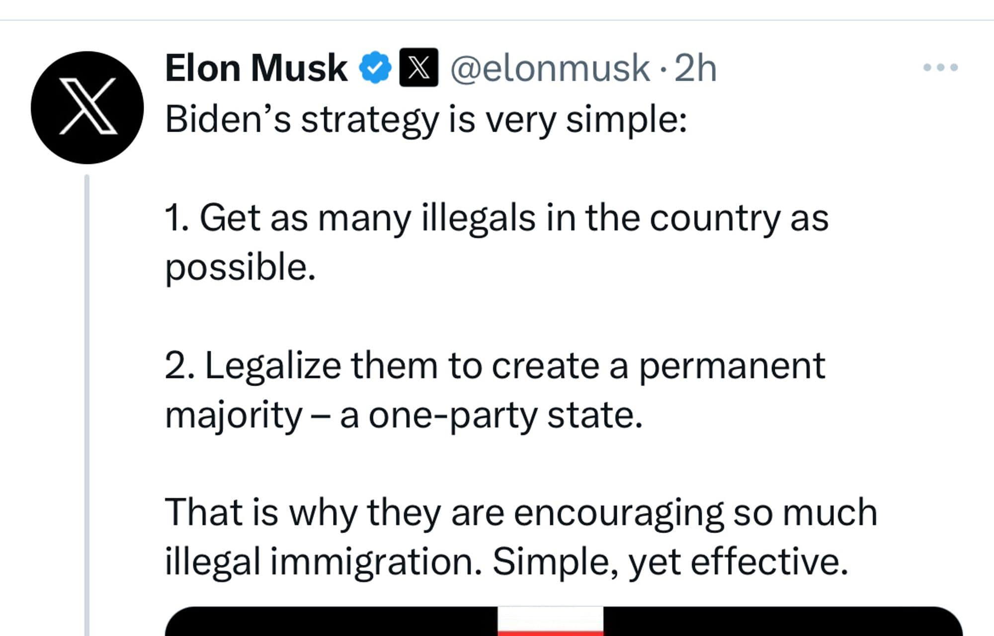 Elon Musk har inte gjort någon hemlighet att hans politiska hemvist är ute till höger, långt ute till höger. I de kretsarna florerar en mängd olika konspirationsteorier och bland dem påståendet att demokraterna öppnat USAs gränser på vid gavel för att locka till sig nya väljare. Den konspirationsteorin är ingalunda ny eller unik. Den finns här hemma också där Sverigedemokraterna bland andra brukar ventilera åsikten att vänster alltid är för en ökad invandring därför att invandrare i stor utsträckning röstar på vänstern. Det spelar ingen som helst roll att Sverige har en ganska stram invandringspolitik med reglerad invandring efter 2015, då Sverige som bekant tog emot ett oproportionerligt antal immigranter. SD sprider fortfarande myten om att Sverige har vidöppna gränser och att det närmast väller in invandrare, varje dag.
