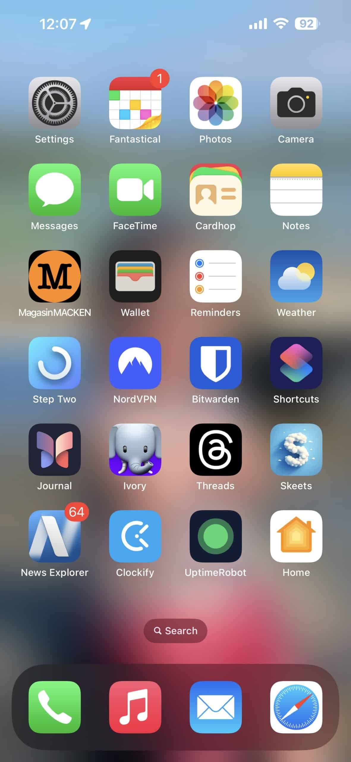 | Telephone Den inbyggda telefon-appen | Apple Music Apples musiktjänst där jag har all min musik – allt det jag lyssnar på. | Mail Apples mail som följer med i iOS. För att hantera min epost. | Safari Apples webbläsare och den webbläsare som jag använder huvudsakligen vid sidan av Brave. |