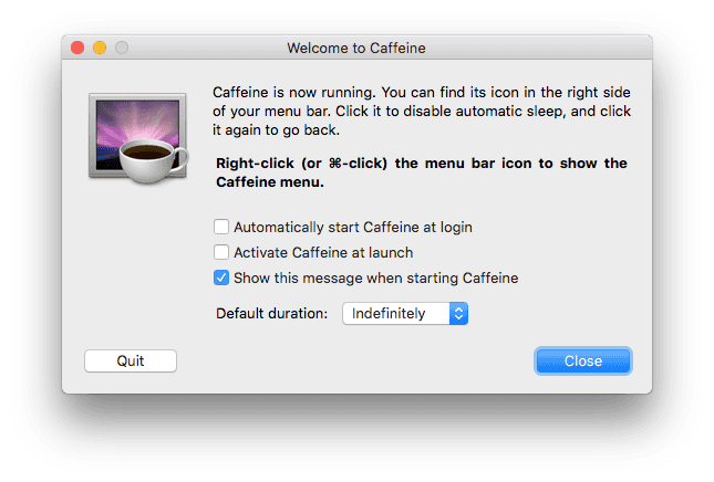 Caffeine är ett litet program som lägger en ikon på högra sidan av menyraden och som kan användas för att hålla liv i din Mac – att inte låta den gå i vila.
