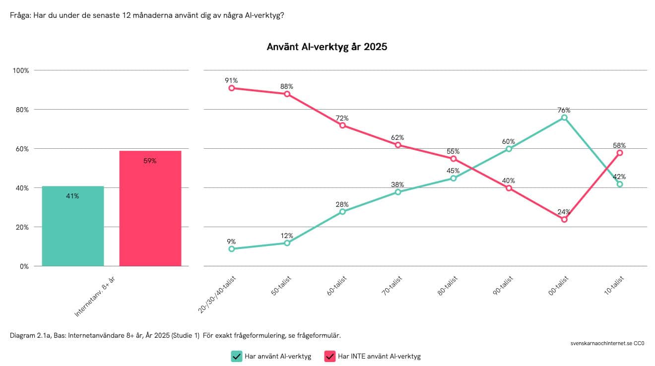 4 av 10 svenskar som är 8 år eller äldre använder AI-verktyg år 2025. De som är födda på 00-talet, och alltså är mellan 15–25 år, dominerar i användningen av AI-verktyg. Nästan dubbelt så många 00-talister använder AI jämfört med genomsnittet av befolkningen. Det mest populära AI-verktyget är ChatGPT, som drygt var tredje svensk använder. Långt efter på andra plats kommer Copilot, som används av var tionde svensk.