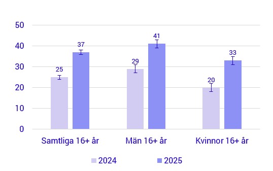 Resultatet från årets undersökning visar en tydlig ökning i användningen av generativa AI-verktyg mellan 2024 och 2025. Bland personer i åldern 16 år eller äldre har andelen som uppger att de använt dessa verktyg stigit från 25 till 37 procent. Män är fortsatt mer benägna att använda generativa AI-verktyg än kvinnor. Bland män ökade användningen från 29 till 41 procent, medan andelen kvinnor steg från 20 till 33 procent. Skillnaden mellan könen består, även om båda grupperna visar en tydlig ökning.