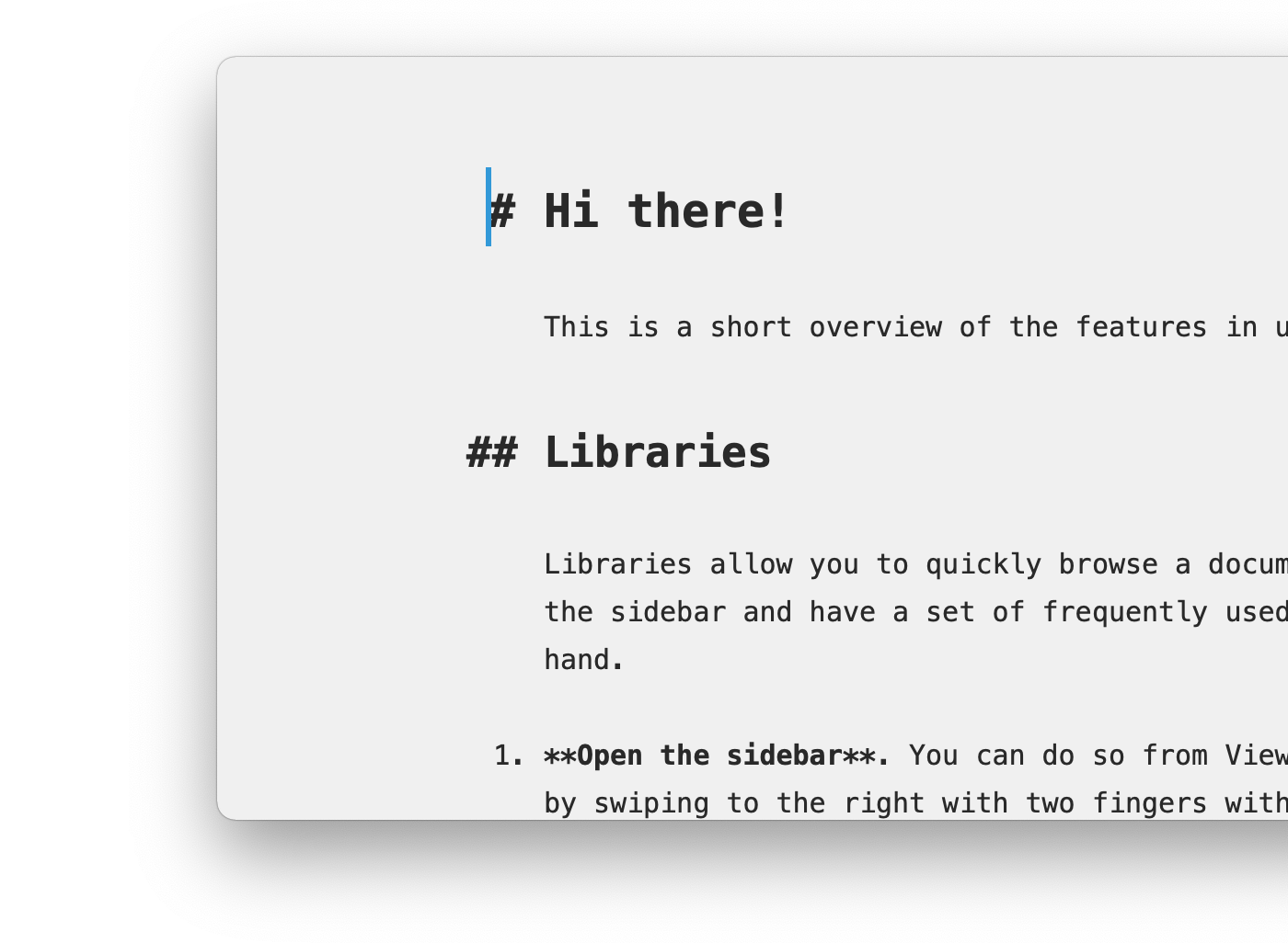 Med en svepning med två fingrar åt höger kan du öppna sidofältet där du kan länka valfri katalog. På så sätt har du alltid ditt eget bibliotek nära till hands och kan snabbt öppna dina mest använda dokument. Knappen högst upp i sidofältet låter dig växla mellan olika bibliotek.
