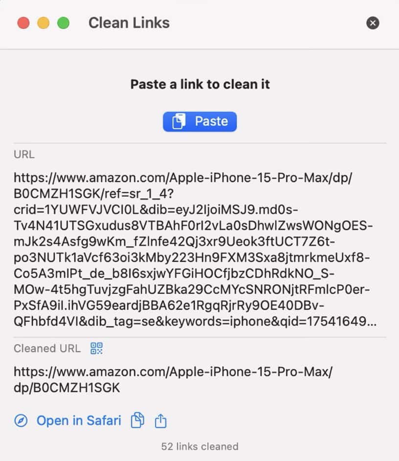 Använd Clean Links som din primära QR-kodsläsare på iPhone, iPad och Mac för att avslöja dolda säkerhetsrisker. Systemet låter dig förhandsgranska den faktiska destinationen innan du öppnar en sida. Spårare rensas bort och förkortade länkar expanderas omedelbart till sitt ursprungliga format.