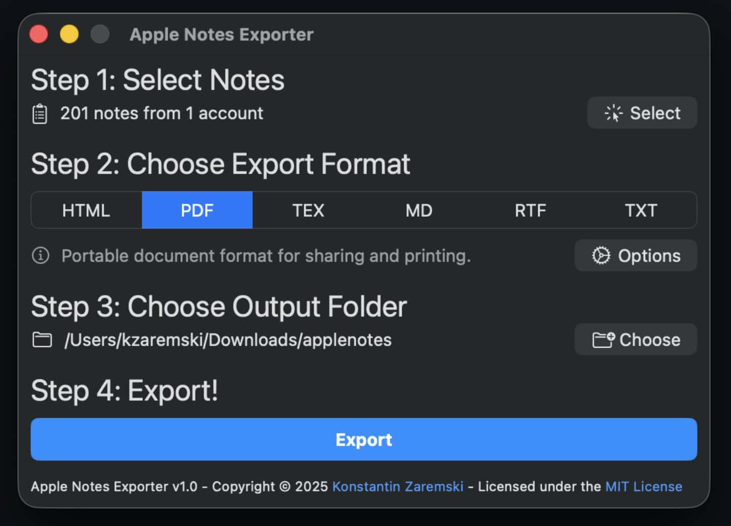 Exportera stora mängder anteckningar från Apple Anteckningar, inklusive innehåll från iCloud, till format som HTML, LaTeX och Markdown.