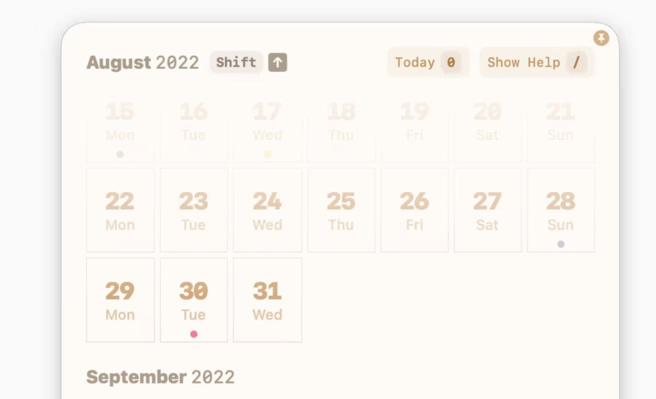 Använd tangentbordet för att snabbt komma åt och navigera i en kalender som som standard visar aktuell månad tillsammans med föregående vecka och de kommande två till tre veckorna. Funktionaliteten inkluderar möjligheten att fästa fönstret, ett timslag som markerar varje…