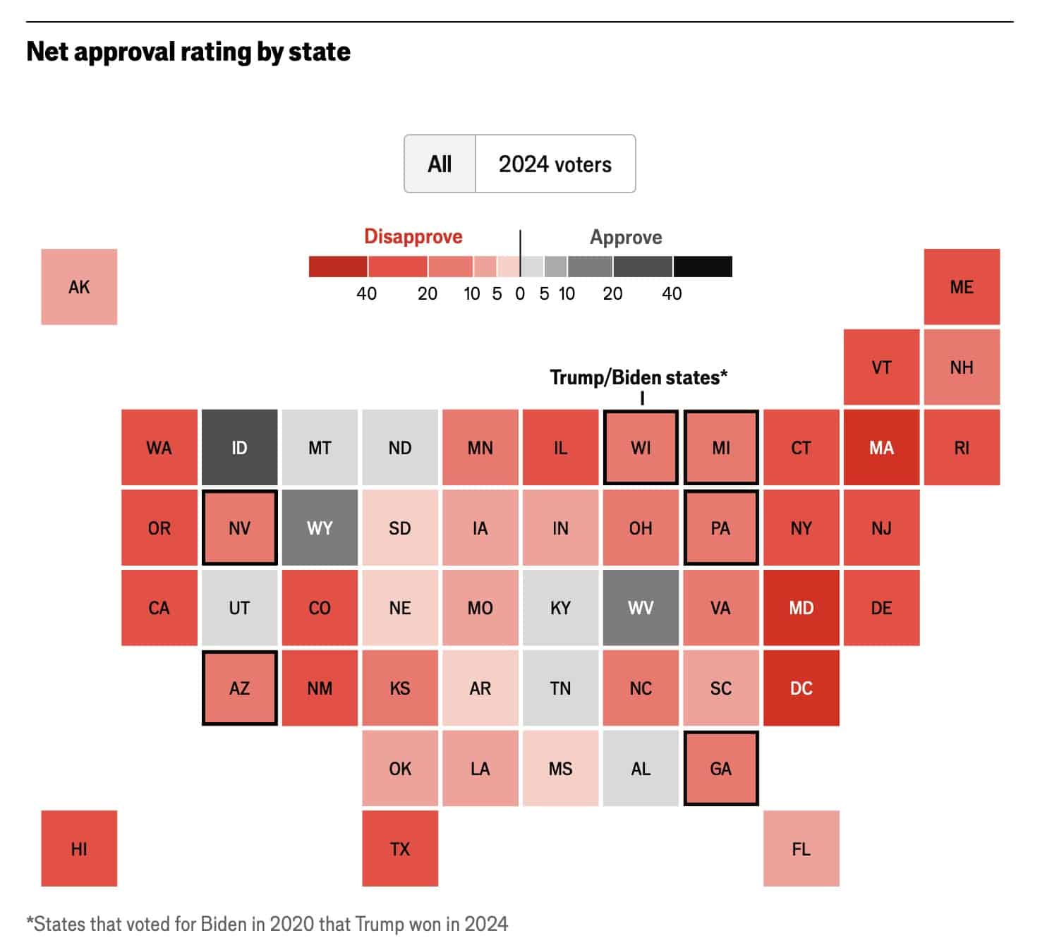 Sedan opinionsmätningar började i modern form har de flesta presidenter inlett sina mandatperioder med ett positivt nettostöd, det vill säga fler väljare som godkänner än som missnöjer sig över deras insats. Båda Trumps mandatperioder började med en nästan jämn delning av opinionen. I båda fallen sjönk hans siffror snabbt till negativt territorium. Det nuvarande nettostödet ligger på -18, den lägsta nivån sedan installationen och tre procentenheter sämre än vid något tillfälle under hans första mandatperiod.