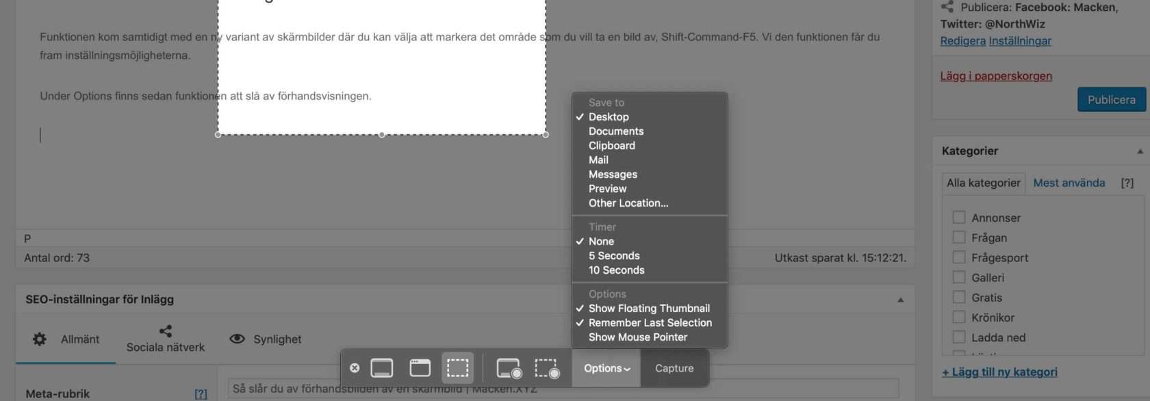 Funktionen kom samtidigt med en ny variant av skärmbilder där du kan välja att markera det område som du vill ta en bild av, Shift-Command-F5. Vi den funktionen får du fram inställningsmöjligheterna.