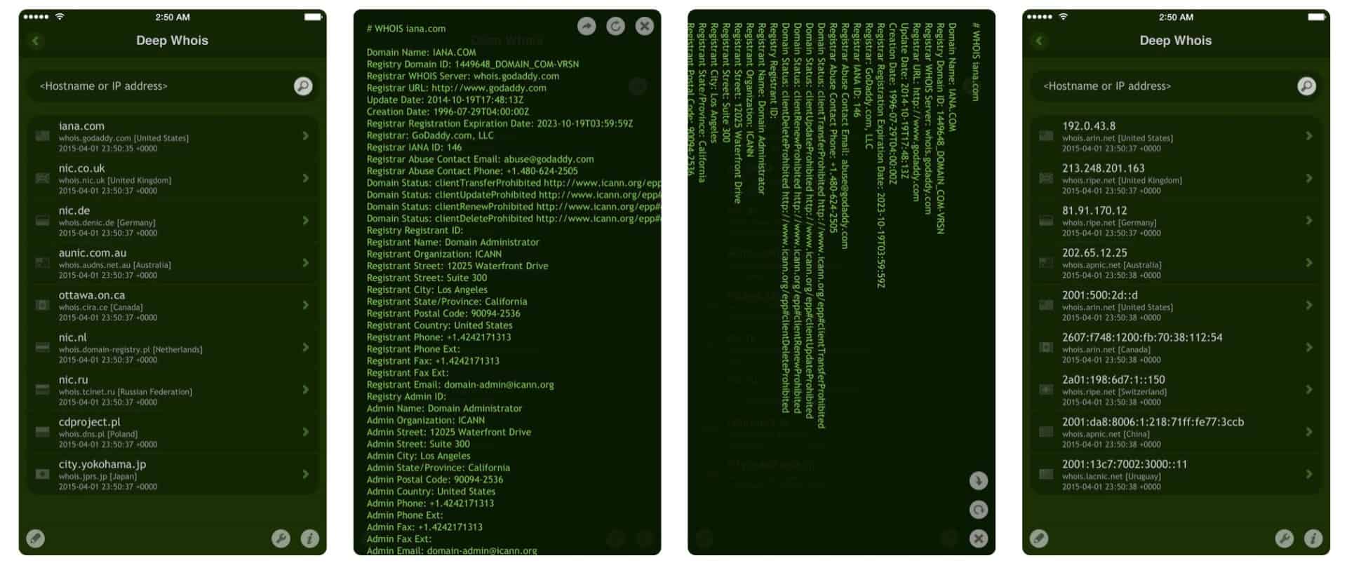 Deep Whois is the most complete and advanced WHOIS app. The tool lets you lookup info in ALL WHOIS databases for ALL hostnames, domains, TLDs, web sites, IDNs, IP addresses (both IPv4 and IPv6), IP network ranges and autonomous systems (ASNs, ISP IDs).