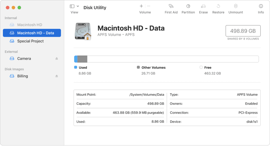 macOs innehåller även ett Diskverktyg som kan användas för att kontrollera att din hårddisk är i gott skick. Diskverktyget kan även kontrollera en del viktiga systemfiler och reparera dem om det är nödvändigt. En Mac som ”badbollar” som går segt kan behöva en omstart och en kontroll med diskverktyget.